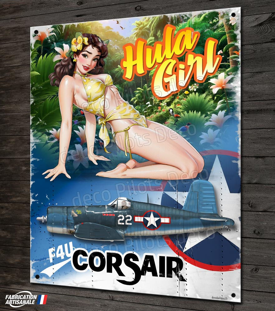 Plaque métal déco aviation F4U Corsair avec pin-up "Hula Girl " warbird ww2.